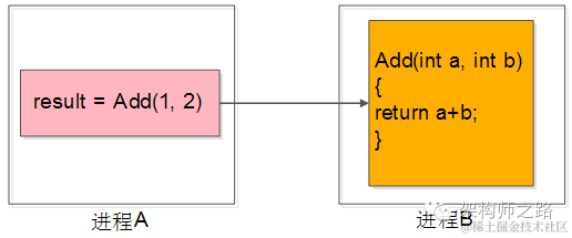 这段代码的时候,我们知道,我们传入了1,2两个入参数,调用了本地代码段中的一个Add函数,得到了result出参。此时,传入数据,传出数据,代码段在同一个进程空间里,这是本地函数调用。