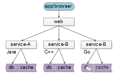 服务化的一个好处就是,不限定服务的提供方使用什么技术选型,能够实现大公司跨团队的技术解耦,如下图: