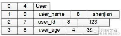 (1)第一行:序号4个字节(设0表示类名),类名长度4个字节(长度为4),接下来4个字节是类名(”User”),共12字节