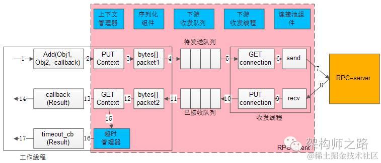 蓝色两个小框,代表了同步RPC-client两个核心组件,序列化组件与连接池组件。
