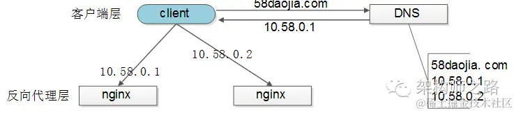【客户端层】到【反向代理层】的负载均衡,是通过“DNS轮询”实现的:DNS-server对于一个域名配置了多个解析ip,每次DNS解析请求来访问DNS-server,会轮询返回这些ip,保证每个ip的解析概率是相同的。这些ip就是nginx的外网ip,以做到每台nginx的请求分配也是均衡的。