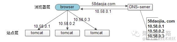 假设tomcat的吞吐量是1000次每秒,当系统总吞吐量达到3000时,如何扩容是首先要解决的问题,DNS轮询是一个很容易想到的方案: