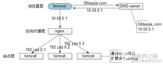 1)站点层与浏览器层之间加入了一个反向代理层,利用高性能的nginx来做反向代理
