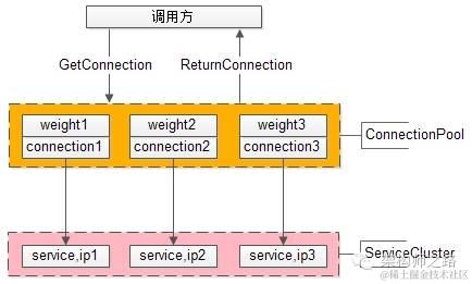 调用方通过连接池组件访问下游service,通常采用“随机”的方式返回连接,以保证下游service访问的均衡性。
