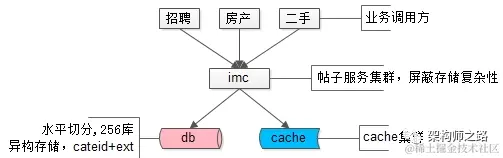 58同城最核心的帖子数据,100亿的数据量,分256库,异构数据mysql存储,上层架了一个服务,使用memcache做缓存,就是这样一个简单的架构,一直坚持这这么多年。上层的这个服务,就是58同城最核心的统一服务IMC(Imformation Management Center) ,注意这个最核心,是没有之一。