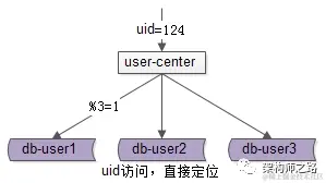 uid属性上的查询可以直接路由到库,如上图,假设访问uid=124的数据,取模后能够直接定位db-user1。