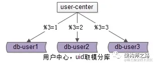 当数据量越来越大时,需要多用户中心进行水平切分。最常见的水平切分方式,按照uid取模分库: