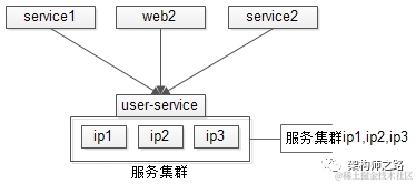 如上图:用户中心服务user-service有三个节点,ip1/ip2/ip3对上游提供服务,任何一个节点当机,都不影响服务的可用性。