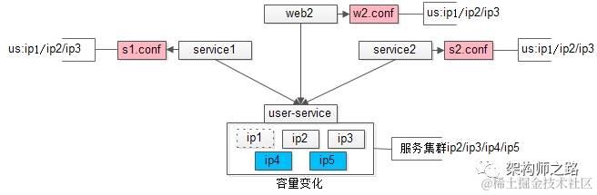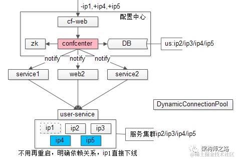 3)所有上游需要拉取配置,需要去配置中心注册,拉取下游服务配置信息(ip1/ip2/ip3)
