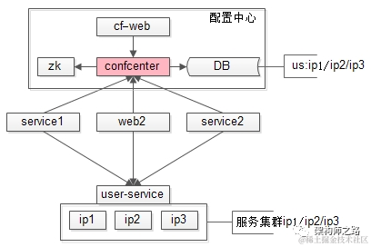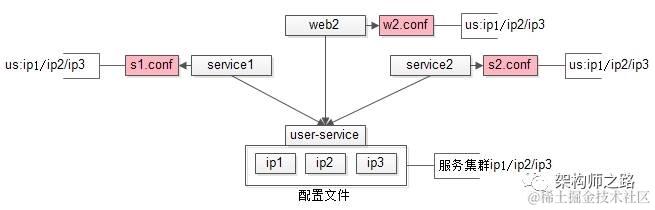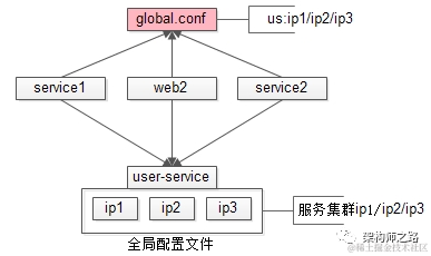 3)service2也调用了用户中心,同理有个配置文件s2.conf,记录了us集群是ip1/ip2/ip3