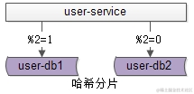 哈希法如上图:也是以用户中心的业务主键uid为划分依据,将数据水平切分到两个数据库实例上去: