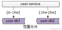 范围法如上图:以用户中心的业务主键uid为划分依据,将数据水平切分到两个数据库实例上去: