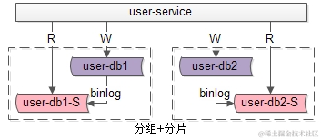 如果业务读写并发量很高,数据量也很大,通常需要实施分组+分片的数据库架构: