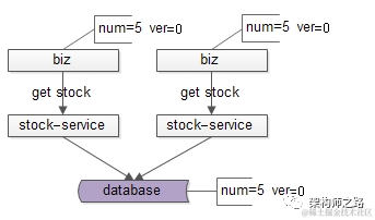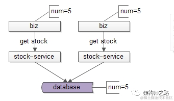 如上图所示,两个并发的查询库存操作,同时从数据库都得到了库存是5。