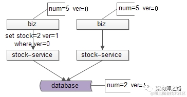 此时假设有并发操作,第一个操作,比对版本号成功,于是把库存和版本号都进行了修改。