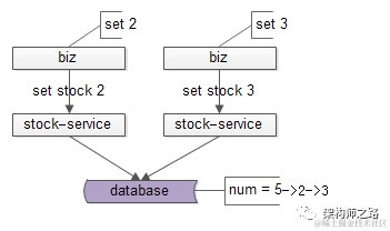 这两个设置库存的接口并发执行,库存会先变成2,再变成3,导致数据不一致(实际卖出了5件商品,但库存只扣减了2,最后一次设置库存会覆盖和掩盖前一次并发操作)