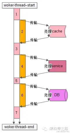 而2,4,6步骤中(上图中橙色时间轴),访问cache、service、DB过程中线程处于一个等待结果的状态,不需要占用 CPU,进一步的分解,这个“等待结果”的时间共分为三部分: