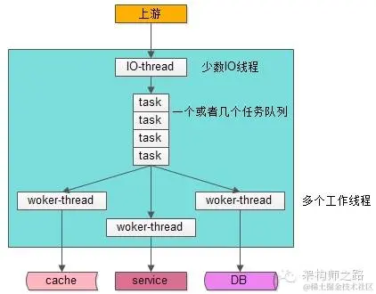 如上图,大部分Web-Server与服务框架都是使用这样的一种“IO线程与Worker线程通过队列解耦”类线程模型: