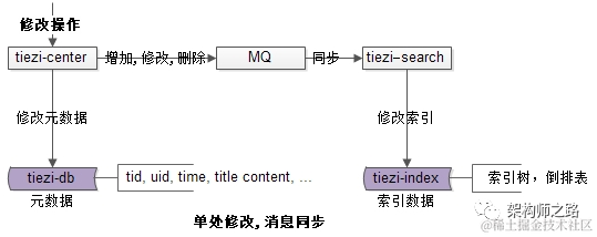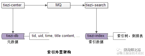 tiezi-search,搜索架构不是本文的重点(外置索引架构设计,请参见《100亿数据1万属性数据架构设计》),后文将重点描述帖子中心元数据这一块的水平切分设计。