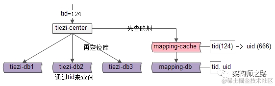 答:tid的查询是单行记录查询,只要在数据库(或者缓存)记录tid到uid的映射关系,就能解决这个问题。