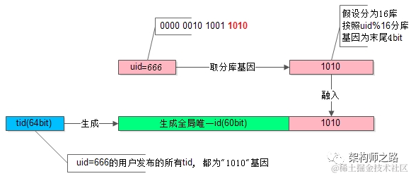 通过uid分库,假设分为16个库,采用uid%16的方式来进行数据库路由,这里的uid%16,其本质是uid的最后4个bit决定这行数据落在哪个库上,这4个bit,就是分库基因。
