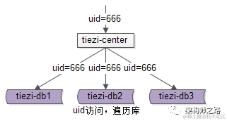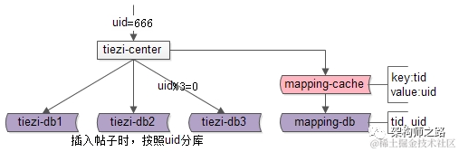 - uid切分法,按照uid分库,同一个用户发布的帖子落在同一个库上,需要通过索引表或者缓存来记录tid与uid的映射关系,通过tid来查询时,先查到uid,再通过uid定位库