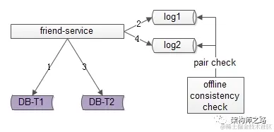 当然,我们还是需要一个离线的扫描工具,不停的比对日志log1和日志log2,如果发现数据不一致,就进行补偿修复