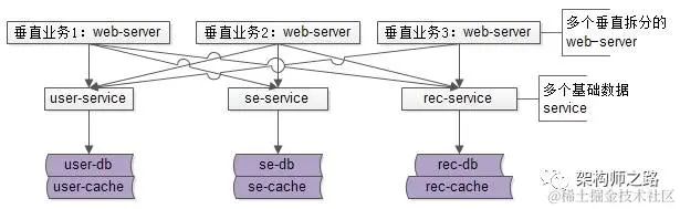 于是系统架构变成了上图这个样子,业务垂直拆分,有若干个基础数据服务: