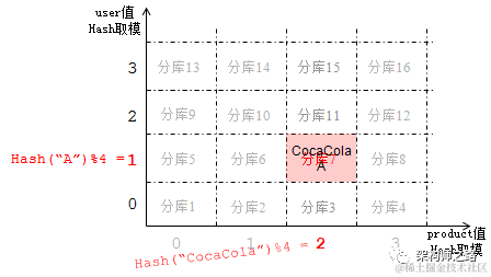 一张表的多个字段同时作为定位库的拆分字段,仍以上图的visit(product, user, info)为例,可以以product和user两个字段来同时来定位库。