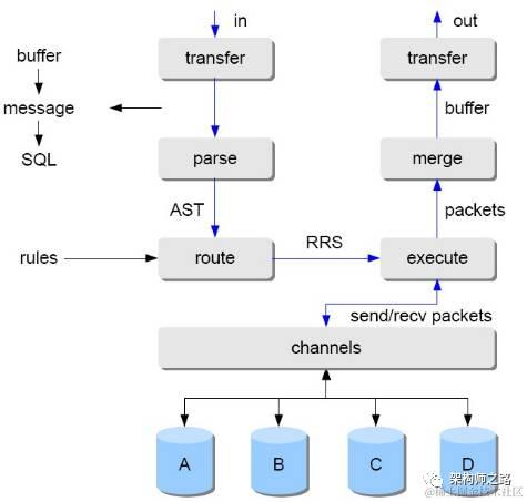 - SQL语句变换,分发至各个分库执行,对结果进行合并