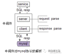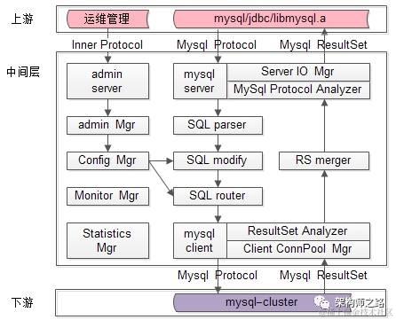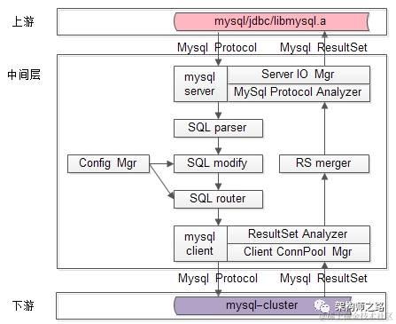 既然选择了mysql client server protocol作为业务层与中间层之间的协议,那么中间层必然是作为mysql-server接收上游的请求,作为mysql-client向真正的mysql发送请求的,中间层的整体结构如下: