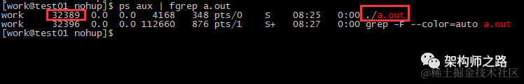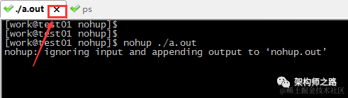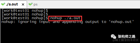 最后测试一下nohup和&同时使用,即用nohup./a.out &运行程序,又会是什么效果呢?