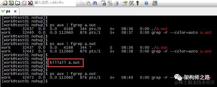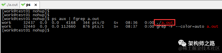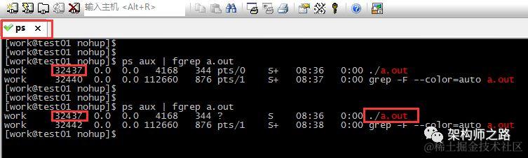 关掉session后,再次ps看一下,ID为32437的a.out进程还在。\