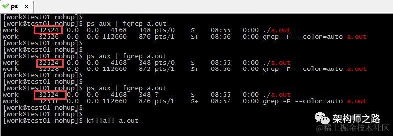 ps再次确认,可以看到关闭session之后,进程号是32389的a.out进程也关闭了。\