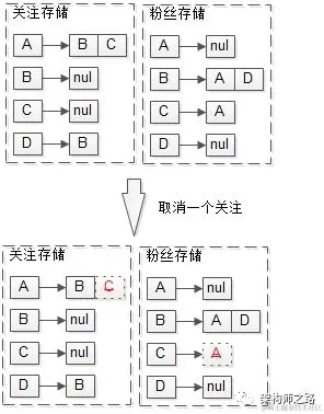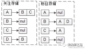 其关系存储又包含关注关系与粉丝关系,“A关注了BC,D关注了B”的潜台词是“B有两个粉丝AD,C有一个粉丝A”。\