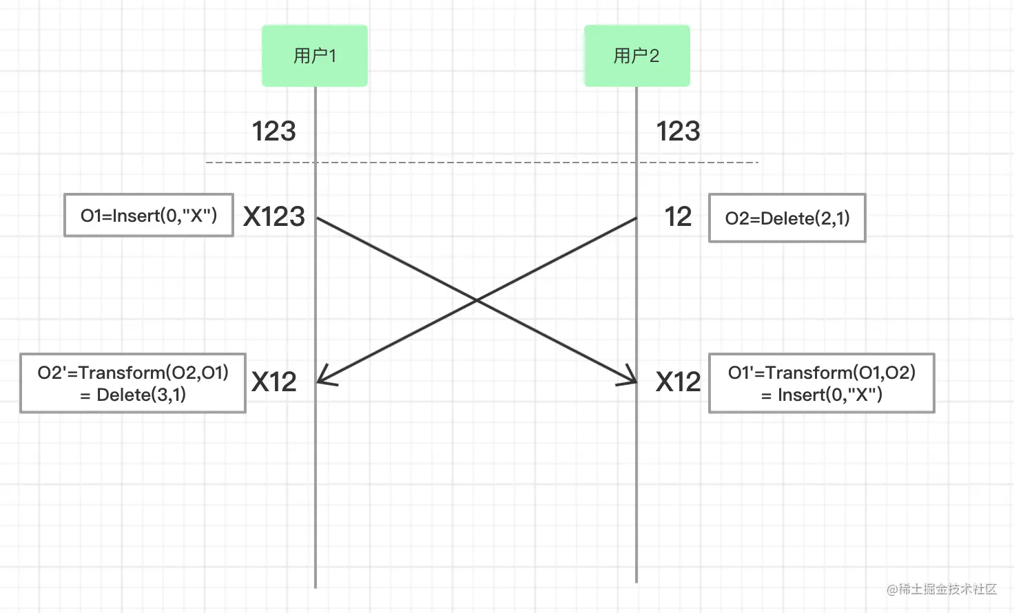 O2'=Transform(O2,O1)= Delete(3,1),O2'虽然也是执行删除操作,但是因为O1已经插入了X字符串,所以删除的位置+1,O2'变成了删除起始位置为3的元素,删除长度是1。对“X123”执行O2'操作,用户1本地的字符串变成“X12”。 - 用户2浏览器中字符串先变成“12”,O1操作到达用户2的浏览器之后,和O2发生转换