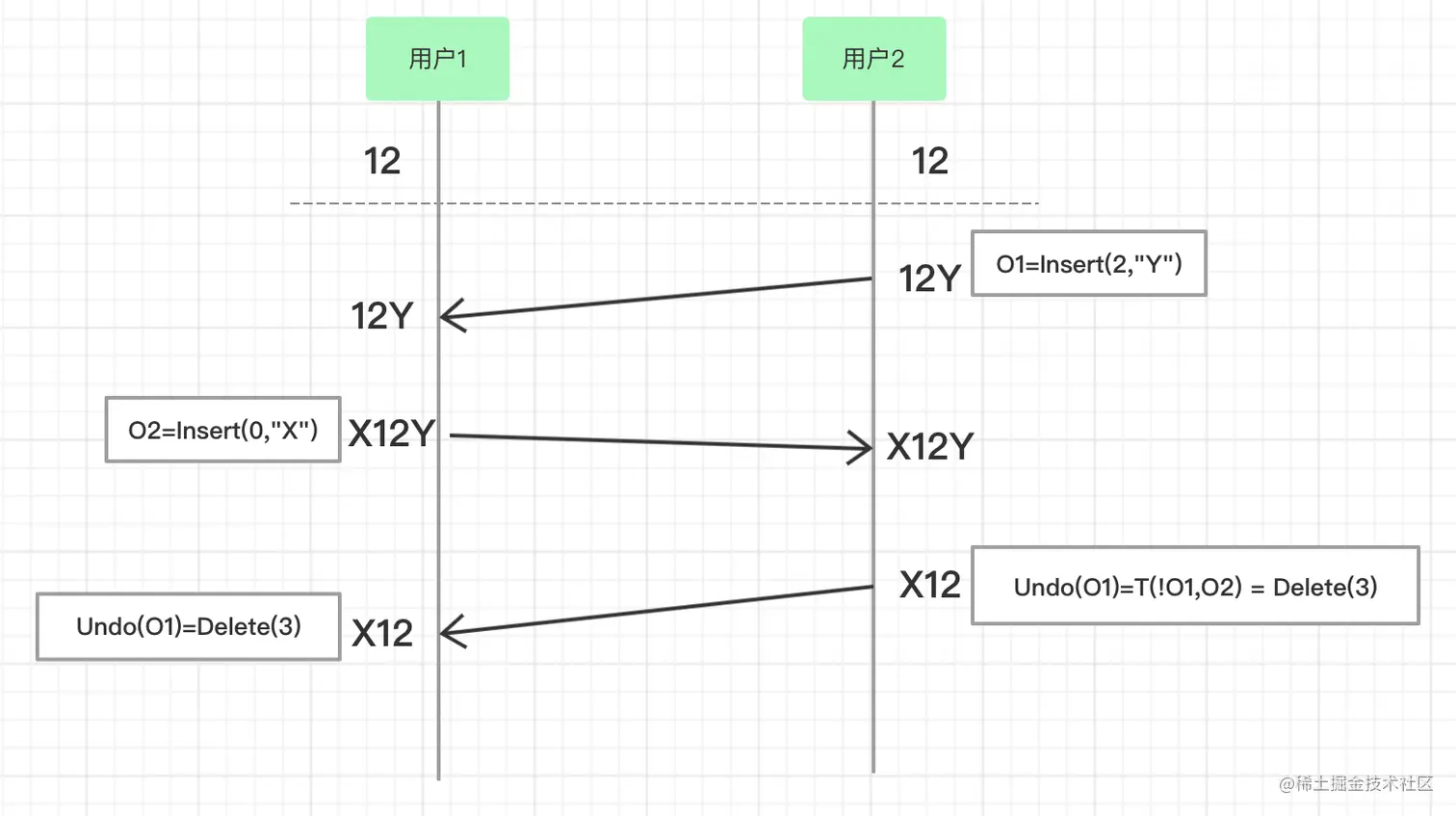 Undo(O1)=T(!O1,O2) = Delete(3)。!O1是O1的逆向操作,本来应该是Delete(2),因为O2在字符串中增加了一个字符,所以此时的撤销操作是Delete(3),删除位置是3的元素,所以用户2本地的字符串变成了“X12”。 - 用户2的操作到达用户1的浏览器,用户1执行Delete(3)之后本地的字符串也变成了“X12”。