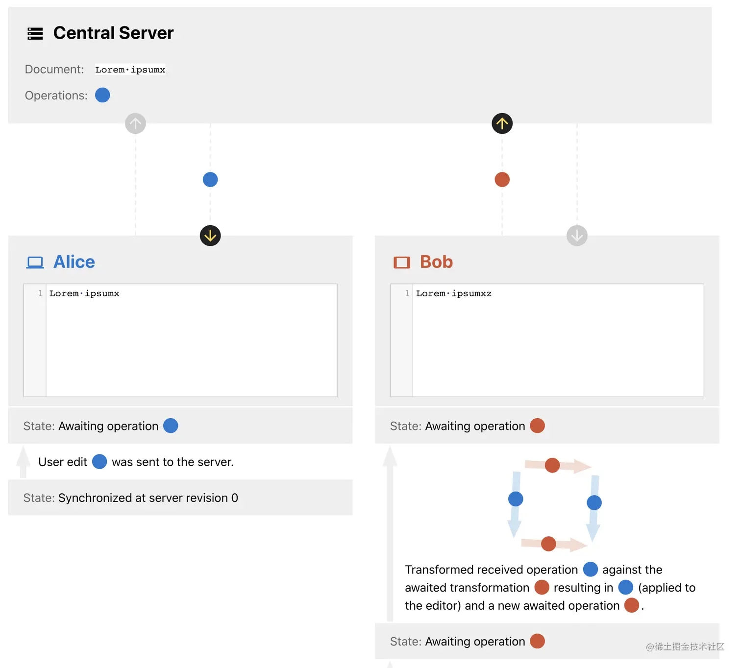 // 当用户编辑文档时把操作发送到服务端,然后切换到AwaitingConfirm状态