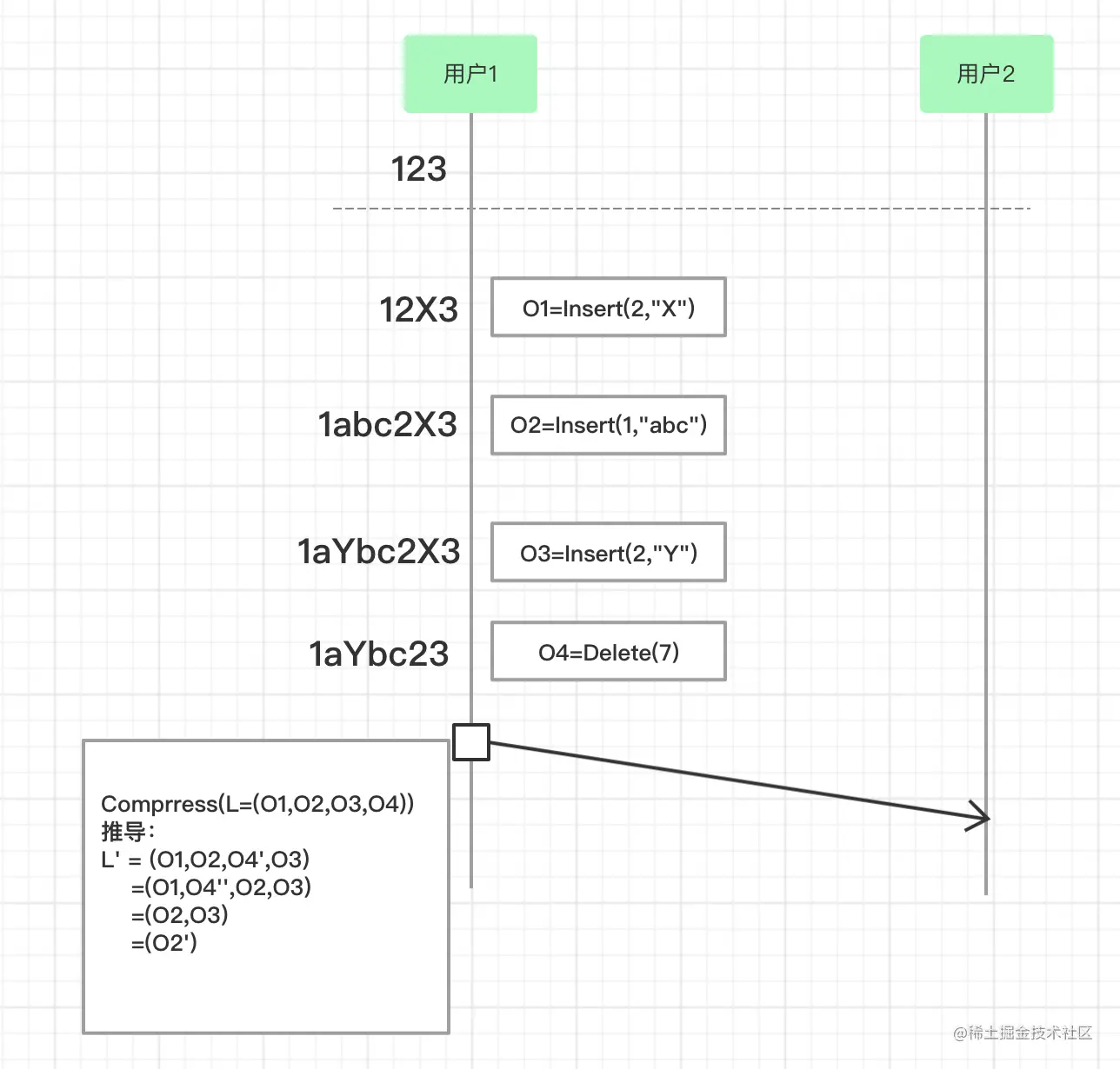 如上图,用户1和用户2看到的初始字符串是“123”。用户1依次进行了4次操作:
