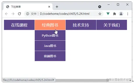 下拉菜单 body { width: 600px; } a { text-decoration: none; display: block; color: #fff; width: 120px; height: 40px; line-height: 40px; border: 1px solid #fff; border-width: 1px 1px 0 0; background: #5D478B; } li { list-style-type: none; } #app > li { list-style-type: none; float: left; text-align: center; position: relative; } #app li a:hover { color: #fff; background: #FF8C69; } #app li ul { position: absolute; left: -40px; top: 40px; margin-top: 1px; font-size: 12px; } \[v-cloak\] { display: none; }在浏览器中运行程序,当鼠标放置在“经典图书”菜单项目时,结果如图5-34所示。