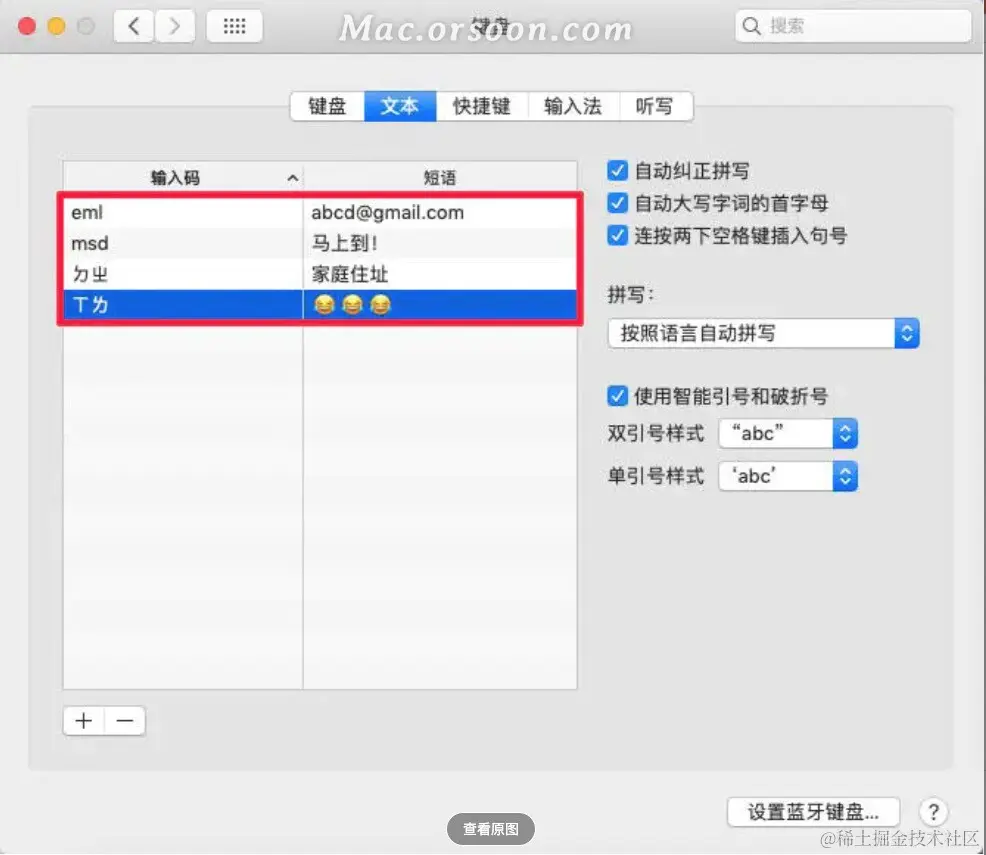 替代文字的设置界面在“系统偏好设置”“键盘”'文本‘中,接着按下左下角的+号就可以开始设置替代文字,这边需要注意几件事: