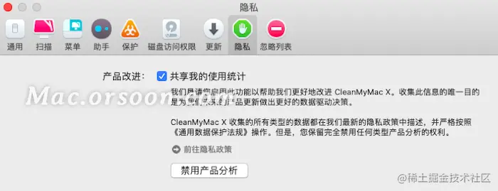CleanMyMac建议用户共享使用统计,以便收集数据,进而改进产品。如若大家注重数据隐私,也可开启“禁用产品分析”。