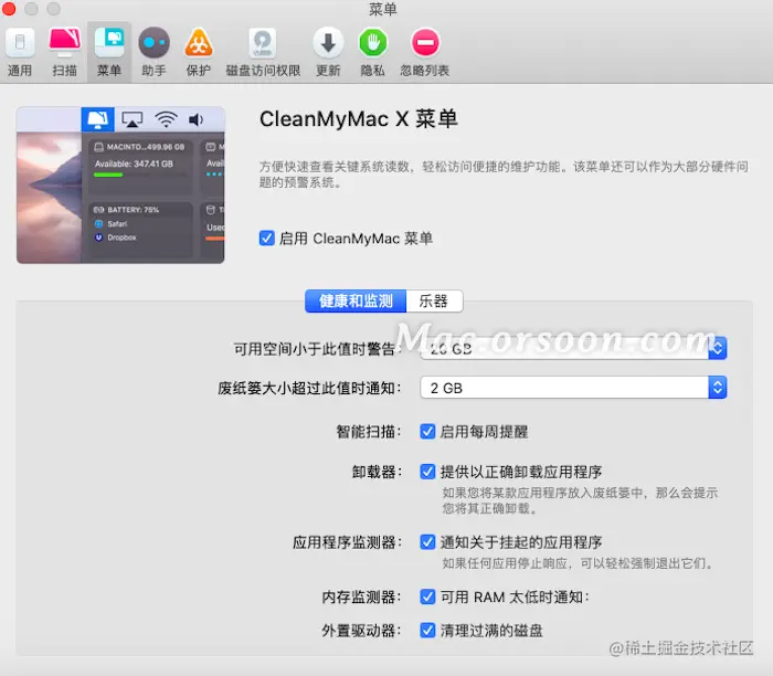 CleanMyMac提供详尽完备的菜单显示服务,用户可勾选是否开启菜单。监测系统空间的使用情况,可勾选小于某一数值时发出警告;废纸篓大小超过某一数值后发出通知;可选择是否开启智能扫描每周提醒;勾选“当用户将某款应用程序放入废纸篓中,那么会提示将其正确卸载”;勾选应用程序监测器、内存检测器以及外置驱动器。