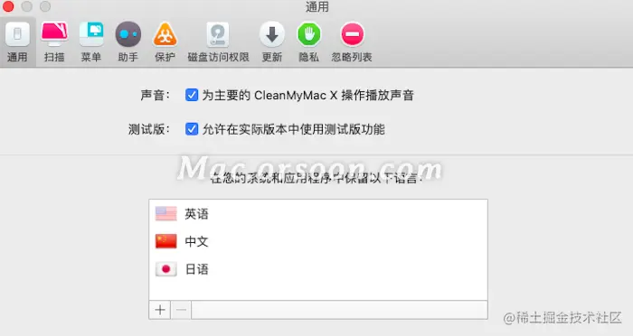 调整CleanMyMac操作播放声音、允许在实际版本中使用测试功能。在系统和应用中添加和删除指定语言。