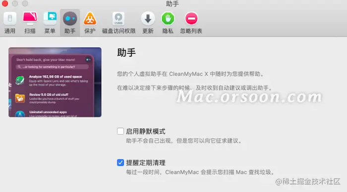 CleanMyMac提供个人虚拟助手服务,主要包含两项功能:1、启用静默模式,即助手不会自动出现;2、提醒每周定期清理,保障日常清理习惯。