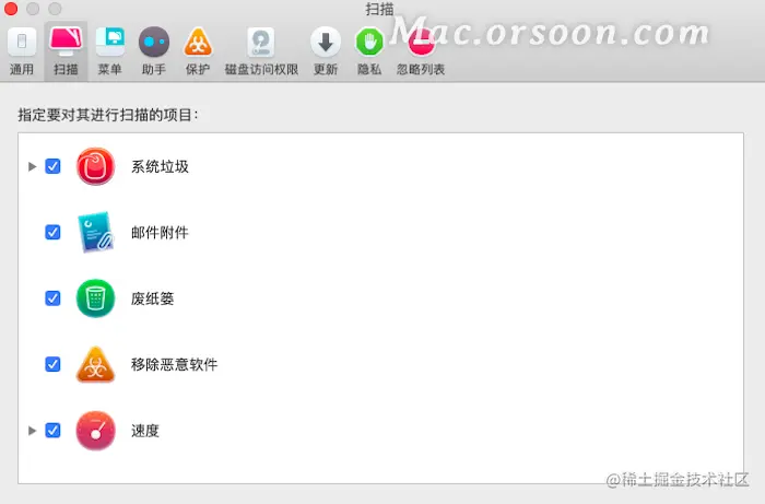 勾选指定进行扫描的项目,囊括系统垃圾、邮件附件、废纸篓、移除恶意软件和速度等。用户可根据实际需求进行选择。