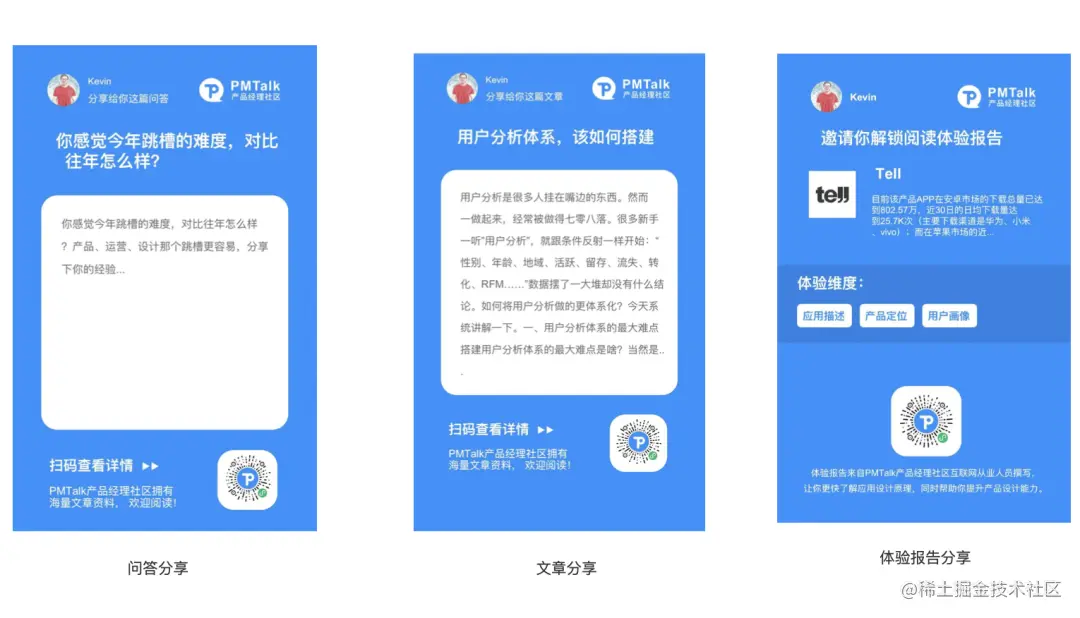 PMTalk小程序的分享目前支持问答、文章、体验报告、活动4个维度的分享,不同内容所展示在海报的字段不同。
