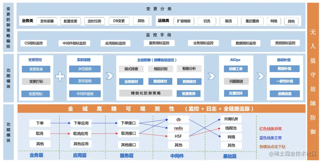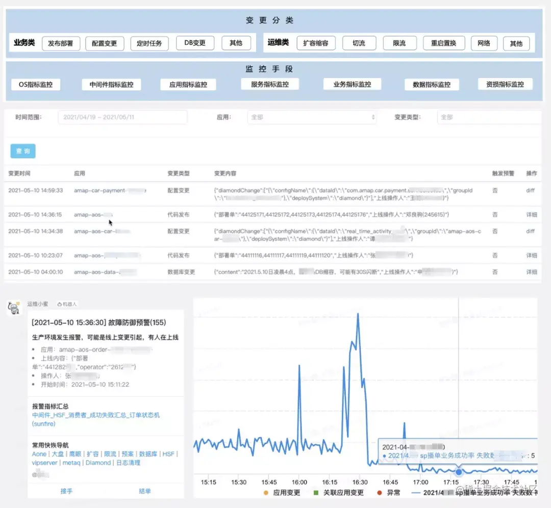 变更防御是对线上变更进行管控,监听变更发生并对变更进行打标分类,针对不同类别的变更,通过不同维度的指标监控、数据和资金核对等手段,自动化识别风险,智能化根因推荐,并提供闭环的应急处置入口。