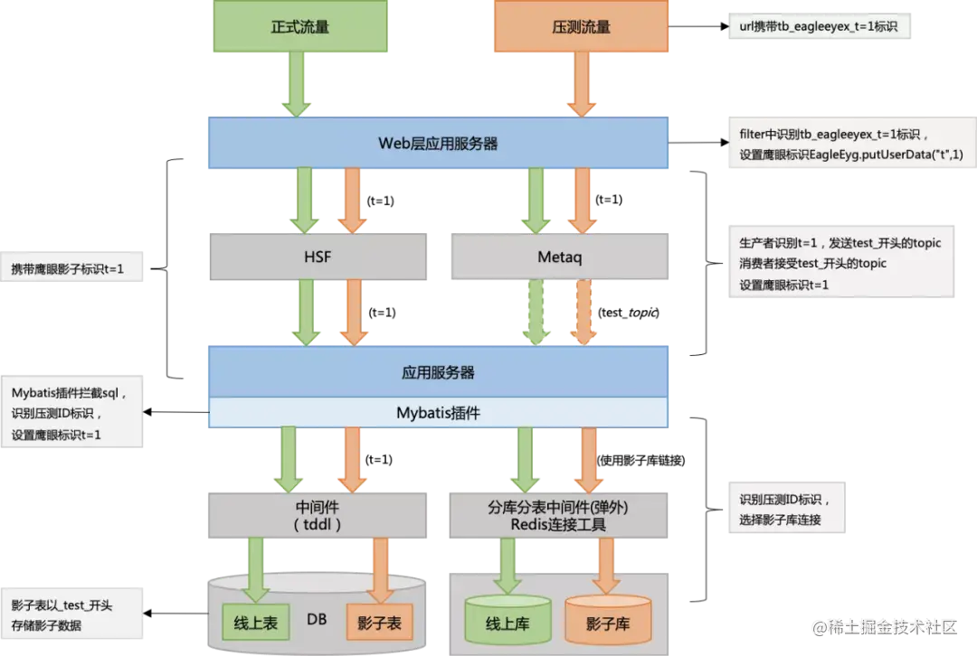 4.Metaq使用不同的 topic (test_开头)区分生产环境消息与压测消息,通过 topic 进行隔离。