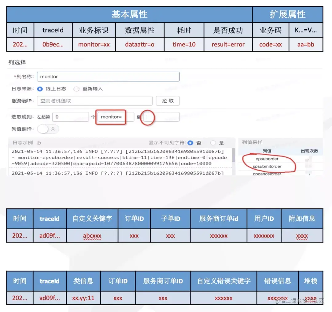 关键信息一般为业务流程中的重要标识,如:订单ID、用户ID等,收集到日志平台后,关键信息一般会作为索引。非关键信息和附加信息不会作为索引。